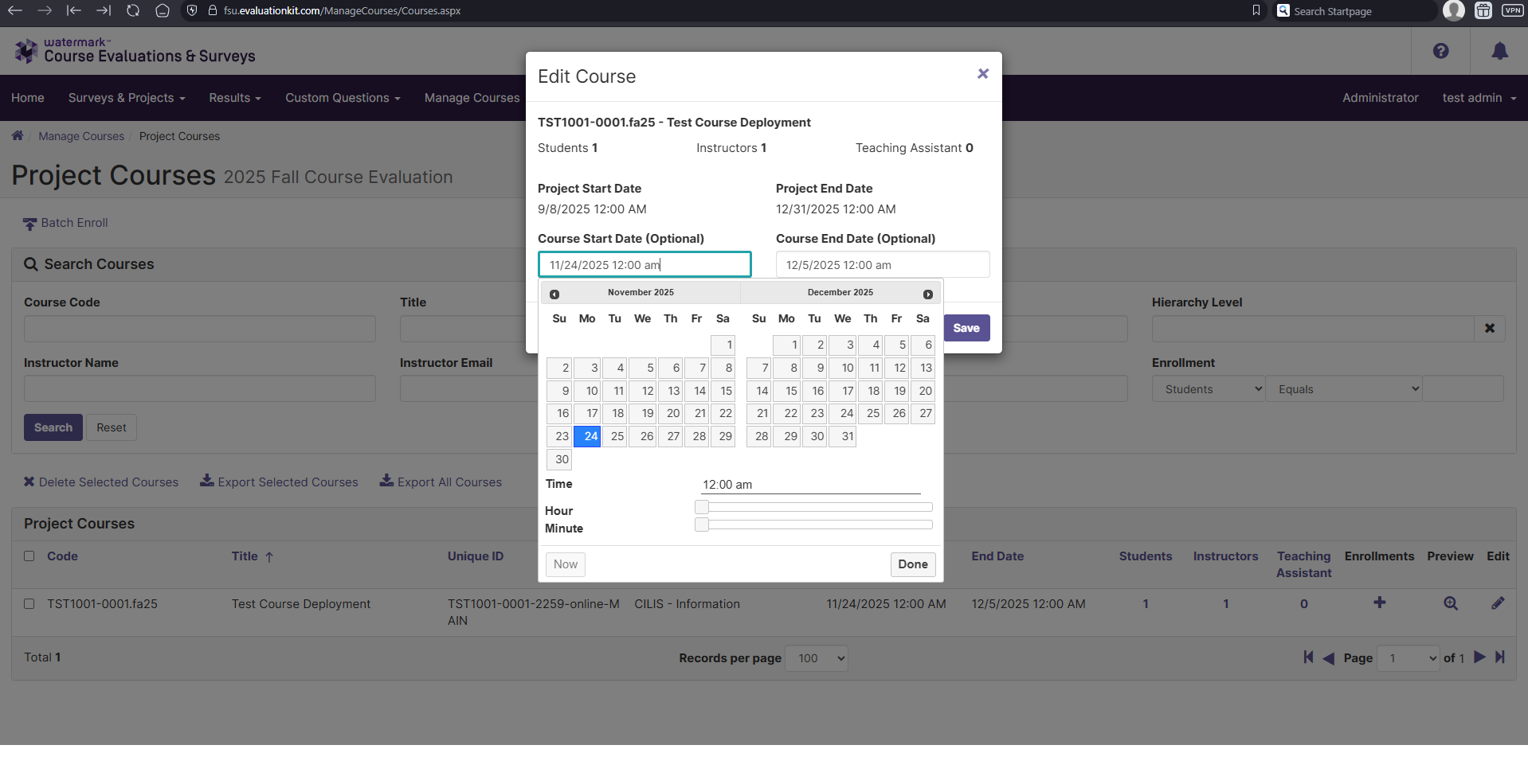 If you need to make changes to the start and end date for course level surveys you can do so by making use of the edit button when viewing courses for a current project. Please exercise caution when making changes to these dates as they can directly affect scheduled emails for all enrolled users and departmental administrators.