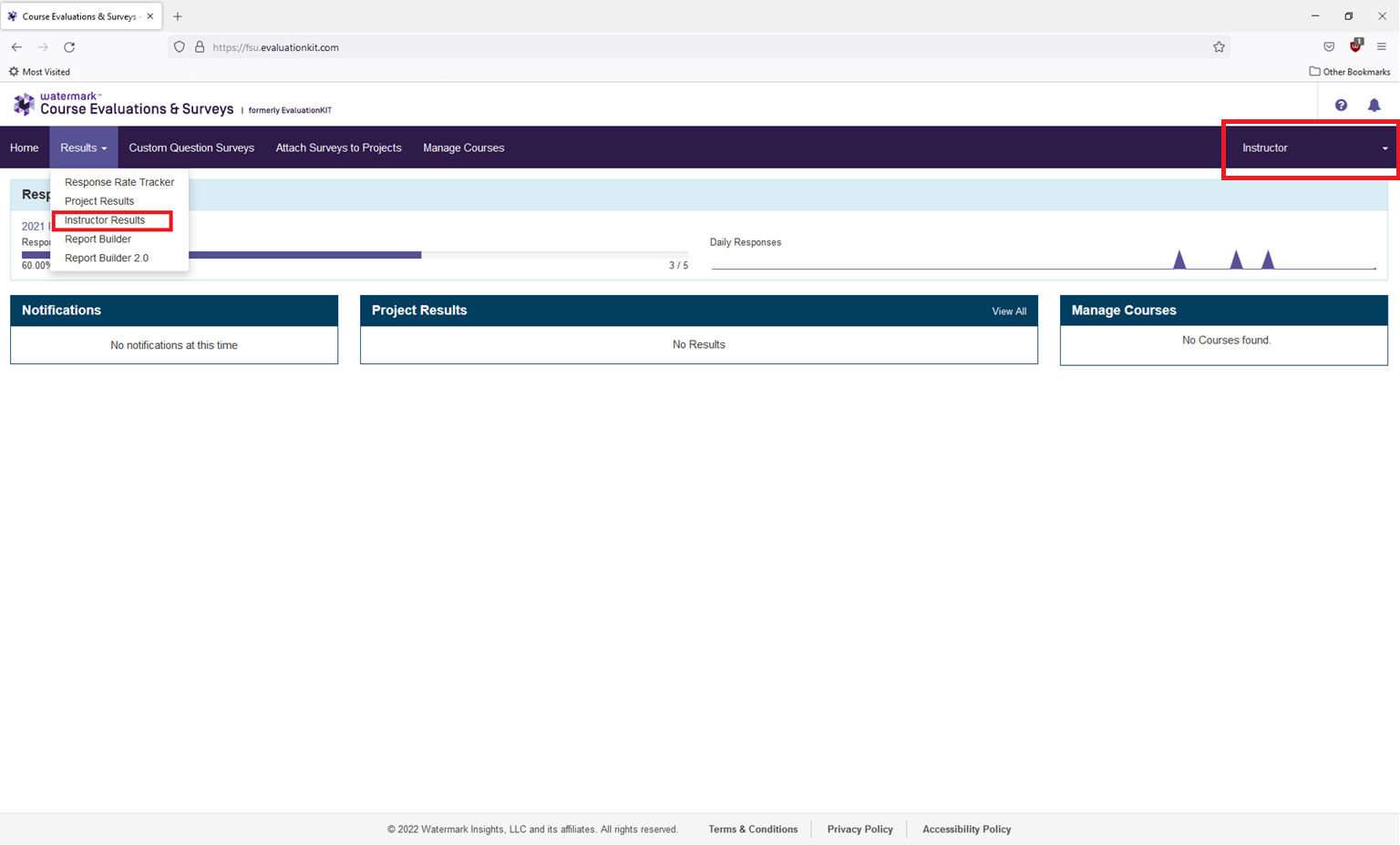 Step 1: Using the Results tab at the top of the screen, select the Instructor Results option. This will bring up a list of all evaluations you have permissions to view. Please note: to access your results you will need to ensure that you are using your instructor account. This can be chosen using the drop down at the top right side of your screen as indicated in this image.