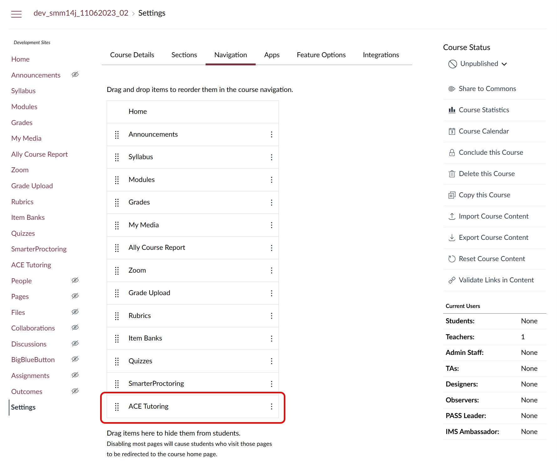 We have integrated FSU's ACE Tutoring with Canvas, which means that you can now add an ACE Tutoring link to your Canvas course navigation menu. Simply follow the directions for enabling a navigation item in the Canvas article How do I manage Course Navigation links?.