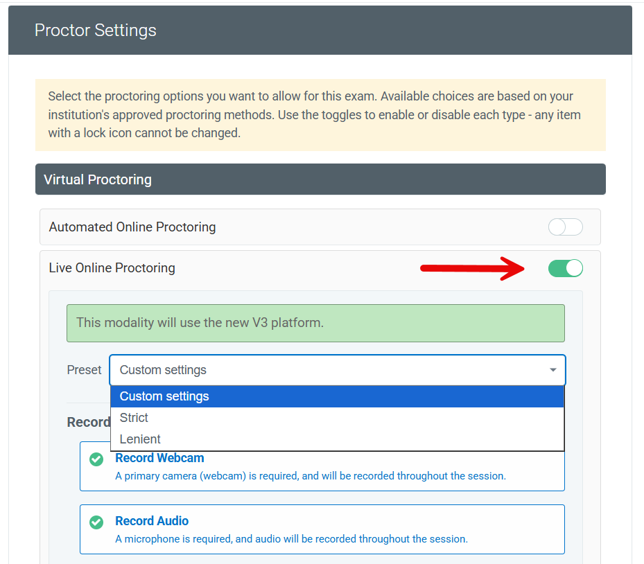 - Choose from Custom settings, Strict, or Lenient depending on your requirements. Then modify any further Recording Options and/or Lock Down Options as preferred.