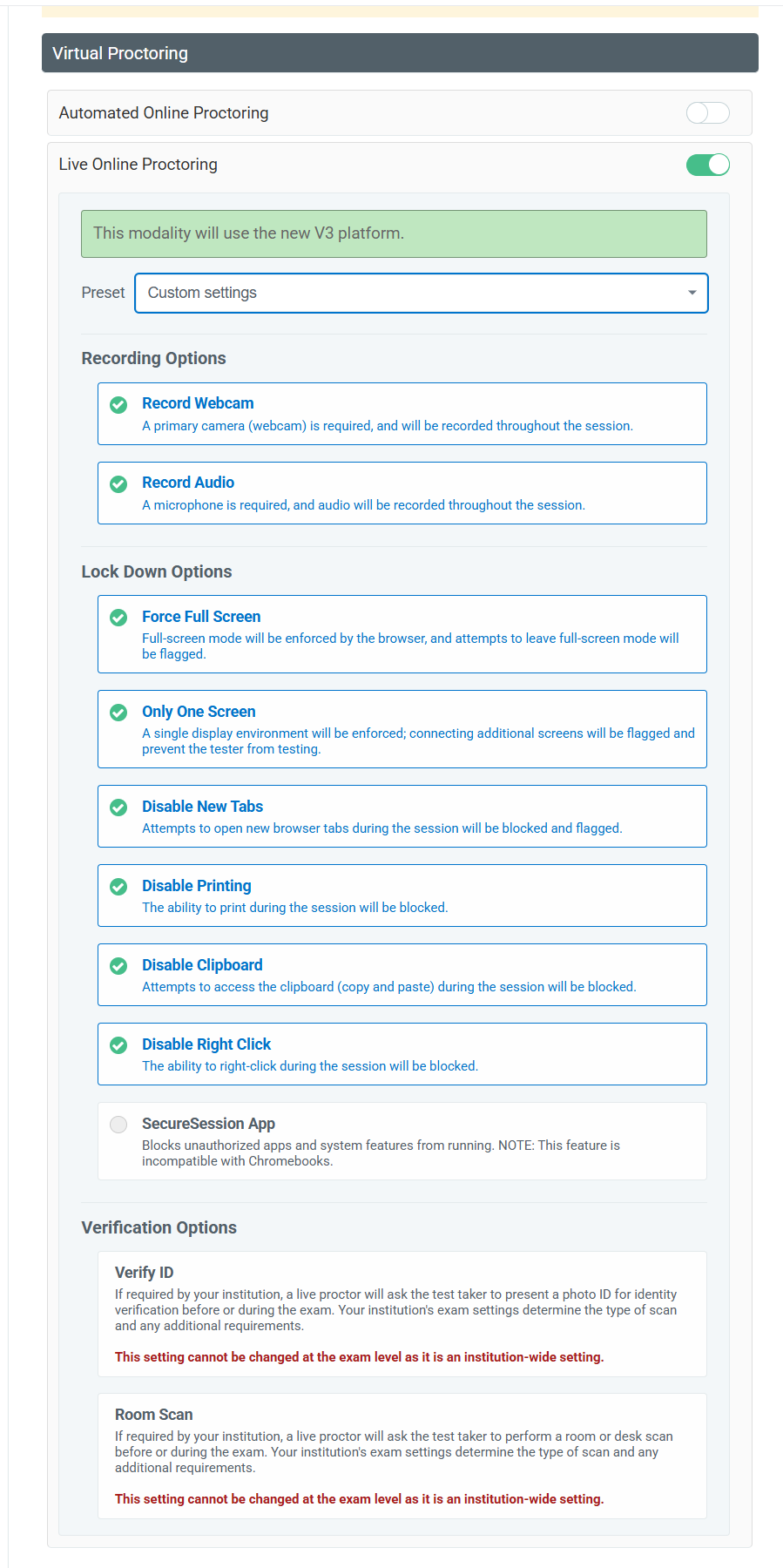 - On the Proctor Settings page, select "Live Online Proctoring." The settings for "Verify ID" and "Room Scan" are already selected, as the live proctor will handle these steps.