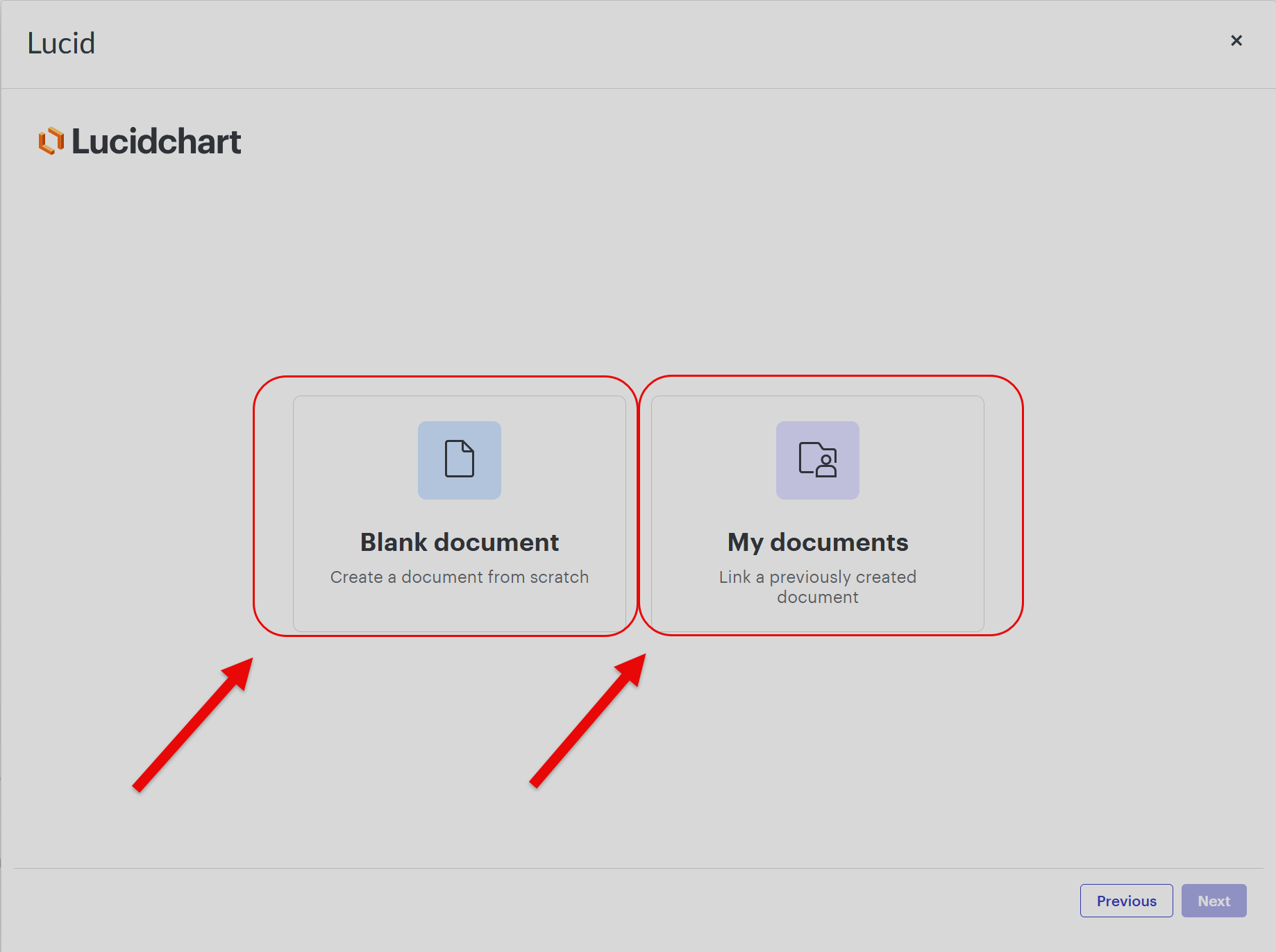 5. Next, you can either create a blank workspace or choose from your library of existing Lucid documents. Select Next when done.
