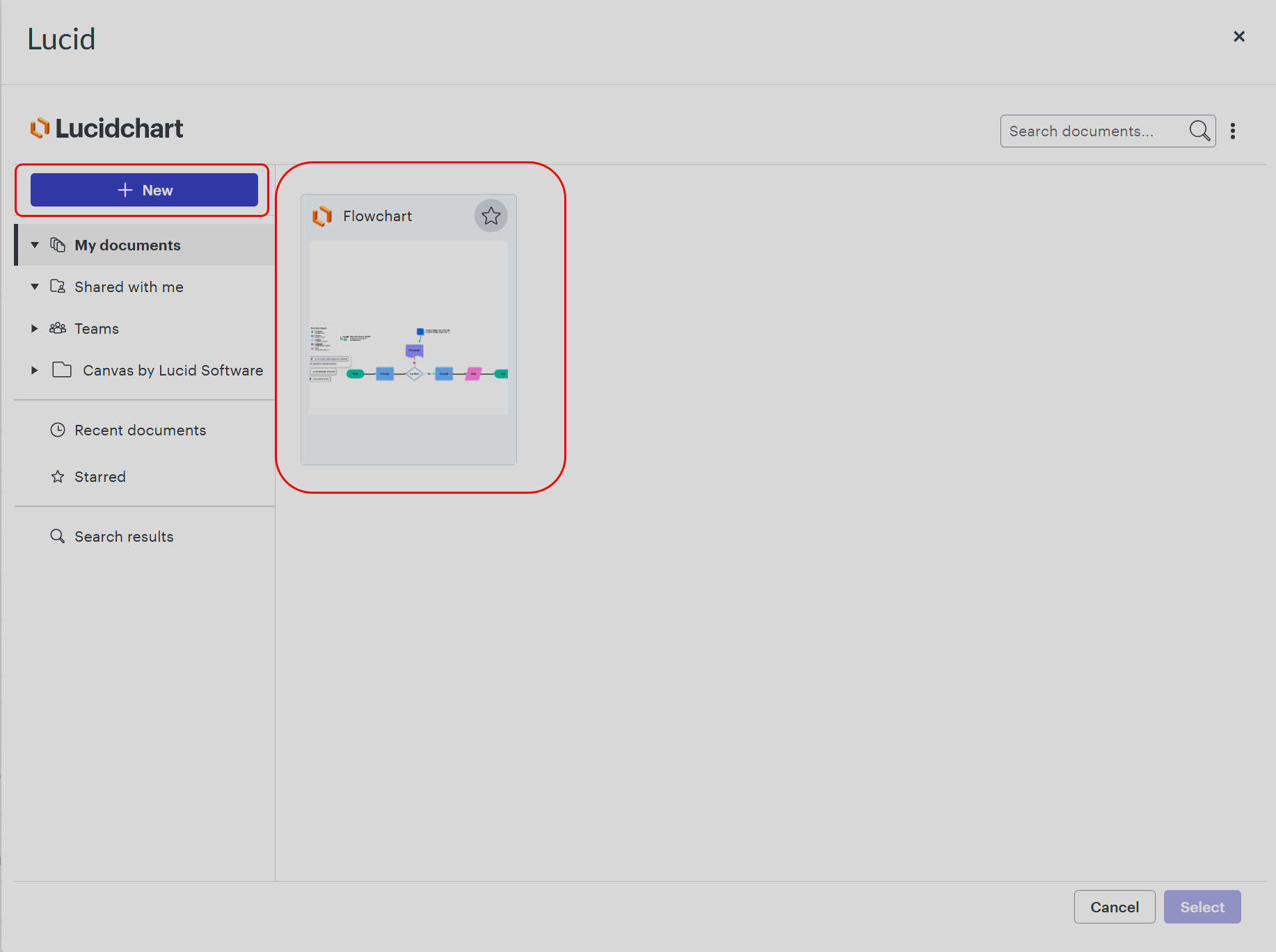 7. Selecting My Documents will allow you to choose from a library of your previously existing Lucid documents. Selecting +New will allow you to either start a new document or choose from an existing template, acting as an iframe with the capacity to choose an assignment, but not edit the document.