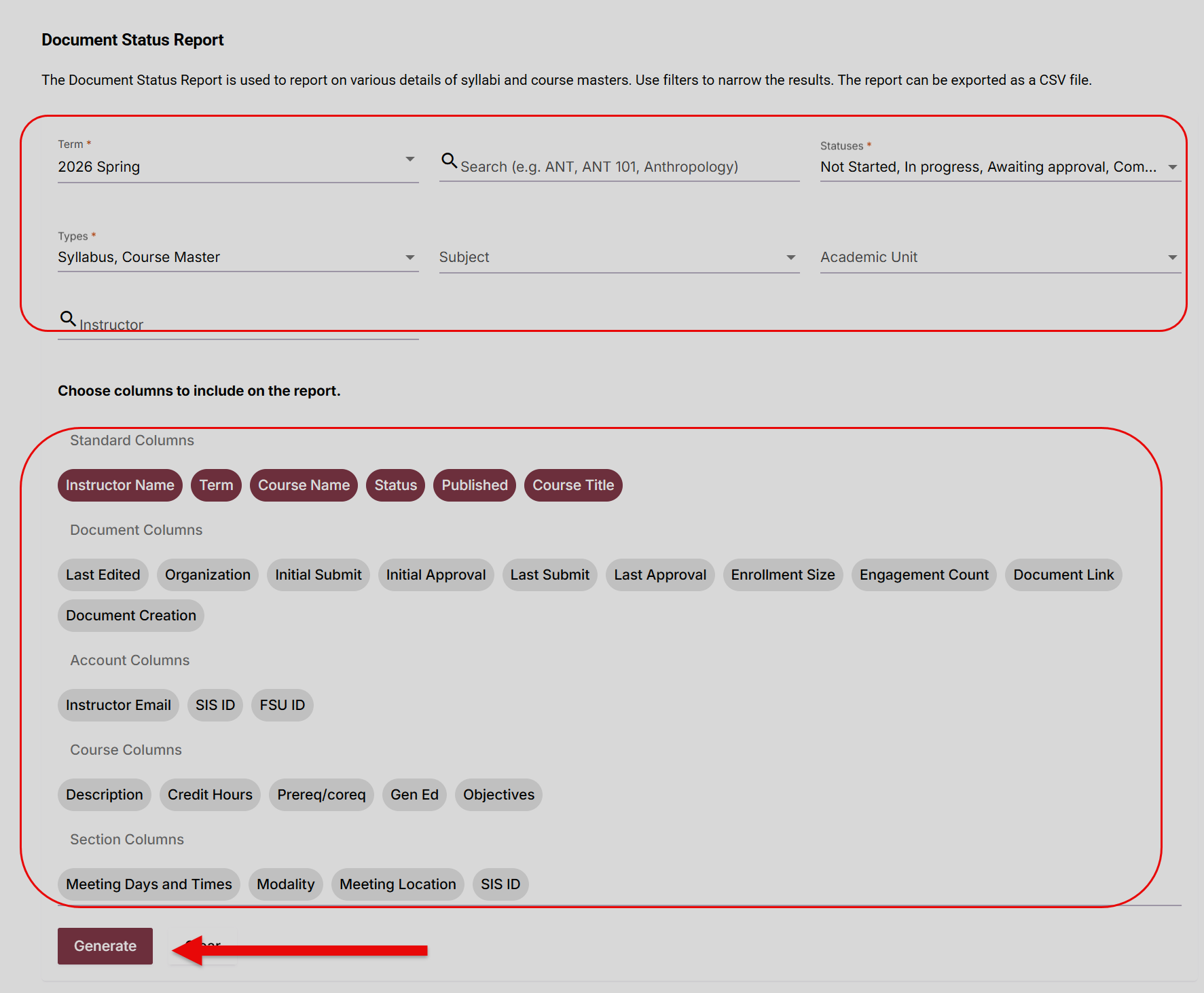 Document Status Report: The document status report is a dynamic report used to gather data on various selected details regarding syllabi. The top section outlines where and when you want the data pulled from, and the bottom section allows you to select what columns you would like included in your report. Select generate to generate the report.