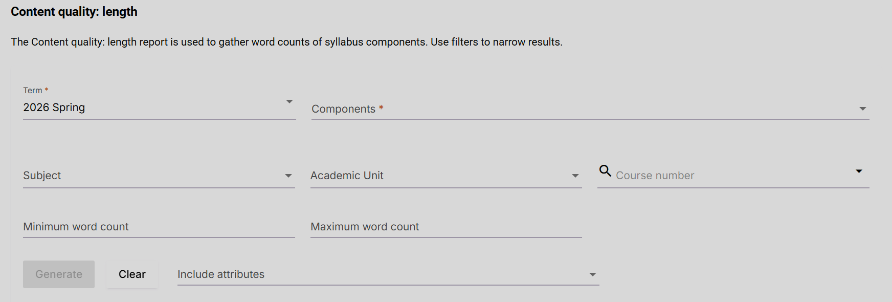 Content quality (length): The Content quality: length report is used to gather word counts of syllabus components. Use filters to narrow results.