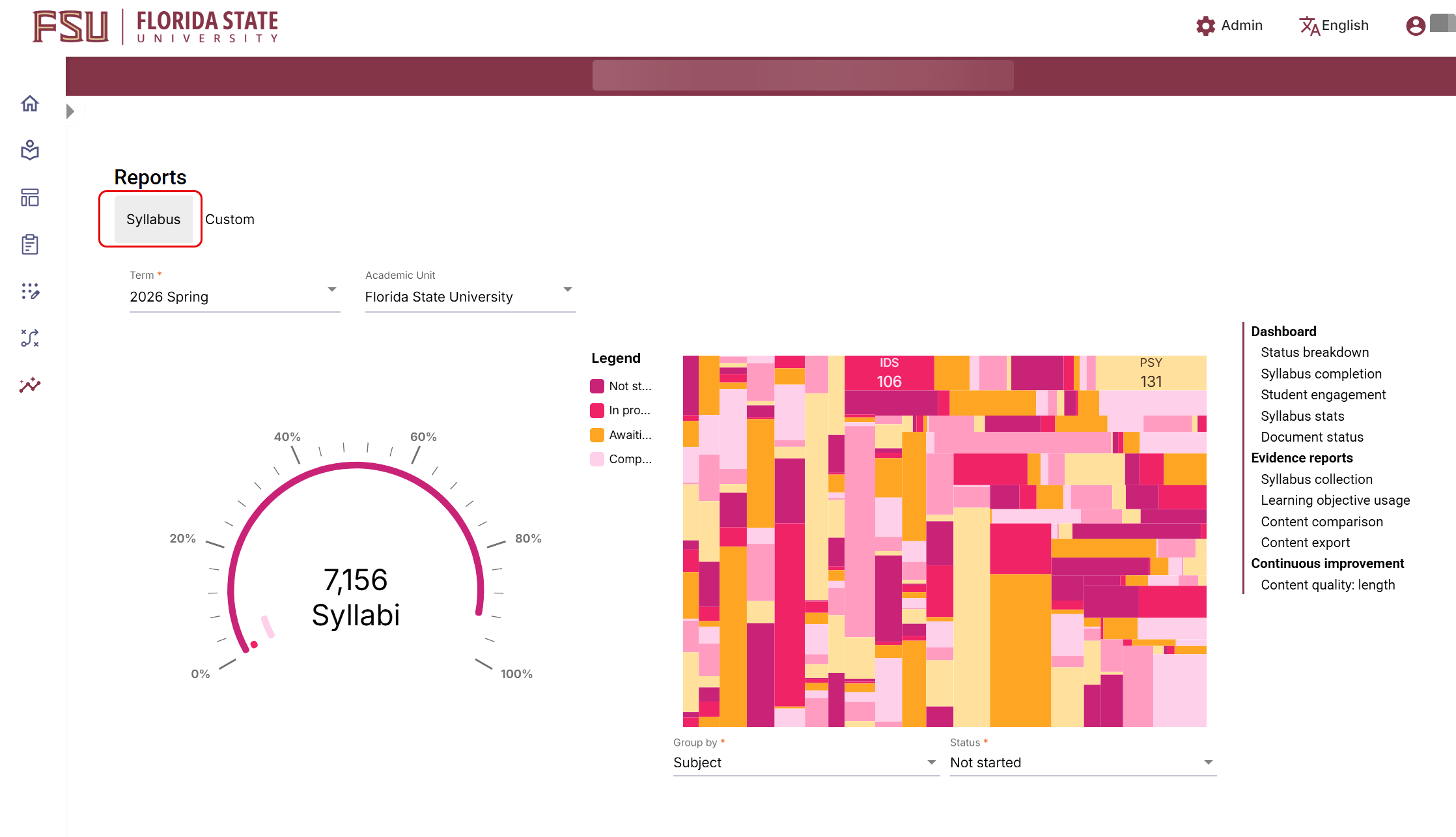You can use the Status dropdown filter on the dashboard to display syllabi that are in progress, not started, awaiting approval, or completed. Alternatively, when using the document status report (see below) to identify incomplete or missing syllabi, you can either adjust filters when generating the report, or filter the data after the report is exported. Further down this page, you can select different report types with varying levels of customization. These include Document Status Report, Syllabus collection, Learning objective usage, Content comparison, Content export, and Content quality: length. Each of these reports outlines the use case in the report description.
