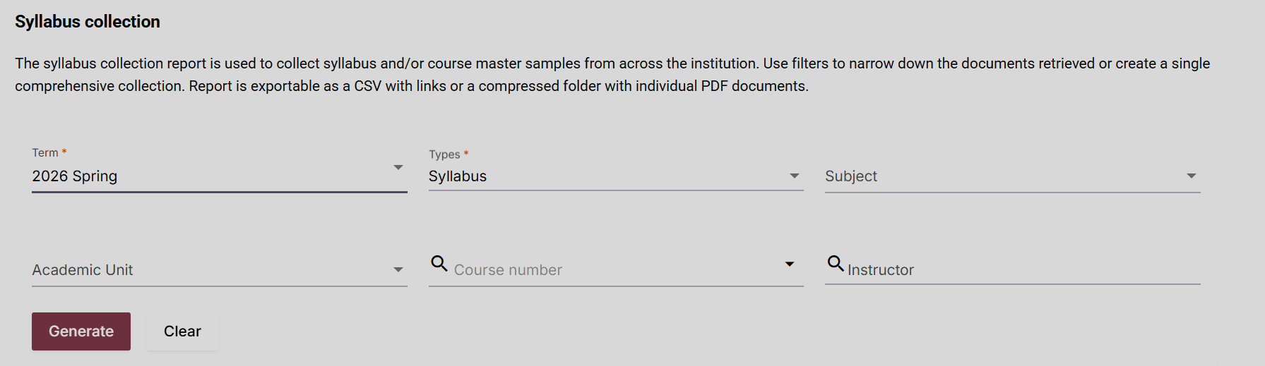 Syllabus collection: The syllabus collection report is used to collect syllabus samples from across the institution. Use filters to narrow the retrieved documents or create a single comprehensive collection. The report can be exported as a CSV file with links or as a compressed folder containing individual PDF documents. Select generate to generate a report on this and all other reports.