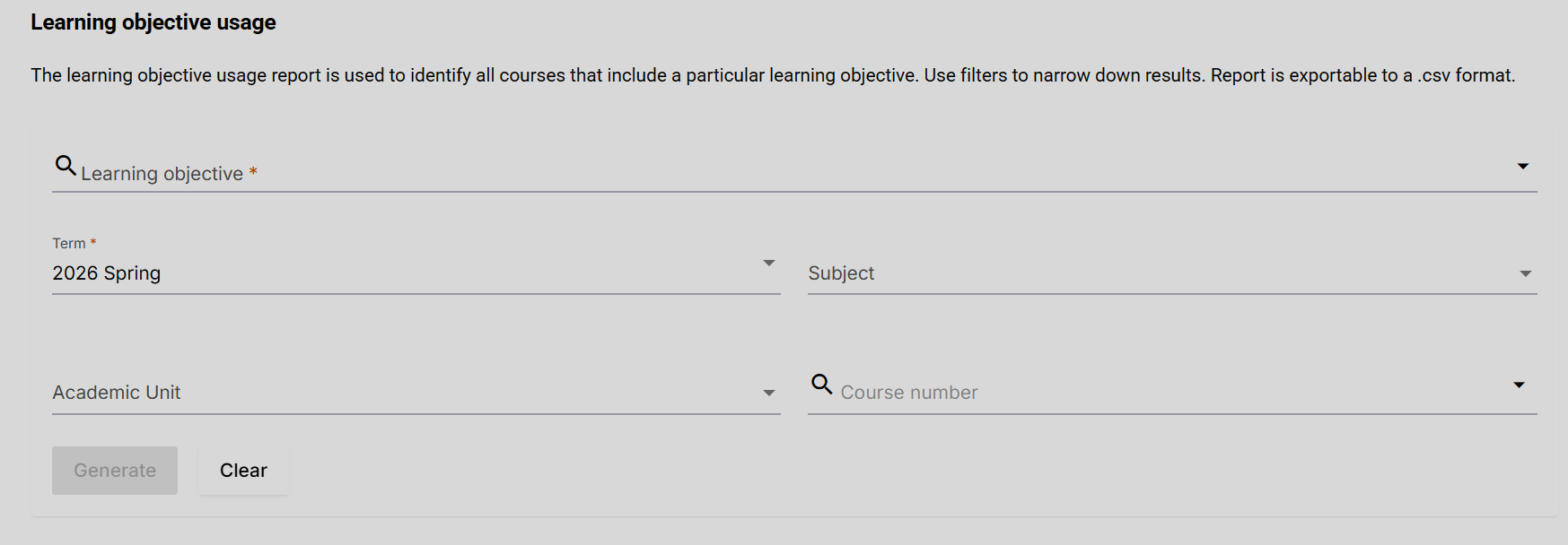 Learning objective usage: The learning objective usage report is used to identify all courses that include a particular learning objective. Use filters to narrow down results. The report is exportable to a CSV format.