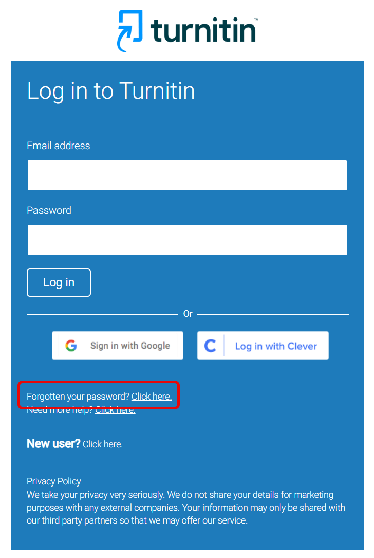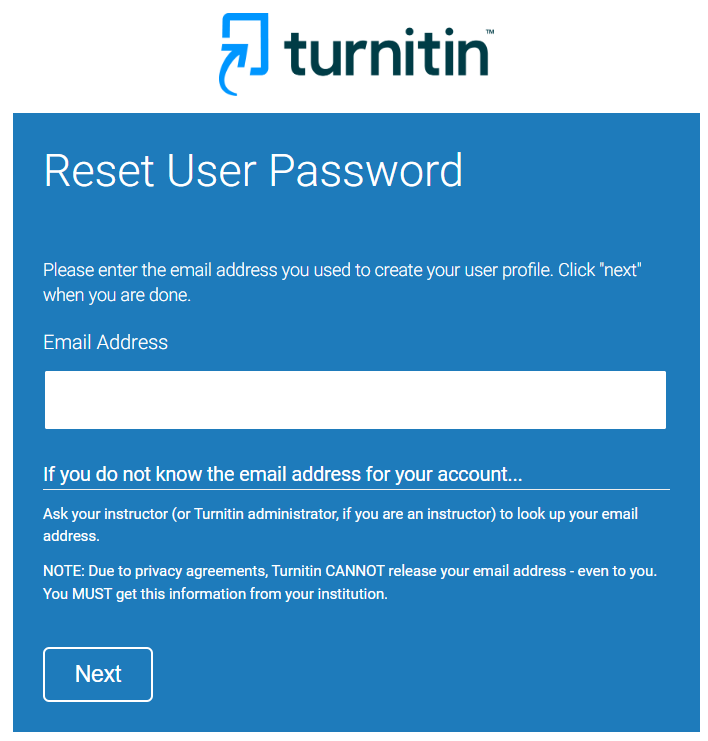 Note: Turnitin specifies that you have 24 hours to use the link to reset your password. If you are unable to do so in the allotted time, you must repeat the above steps.